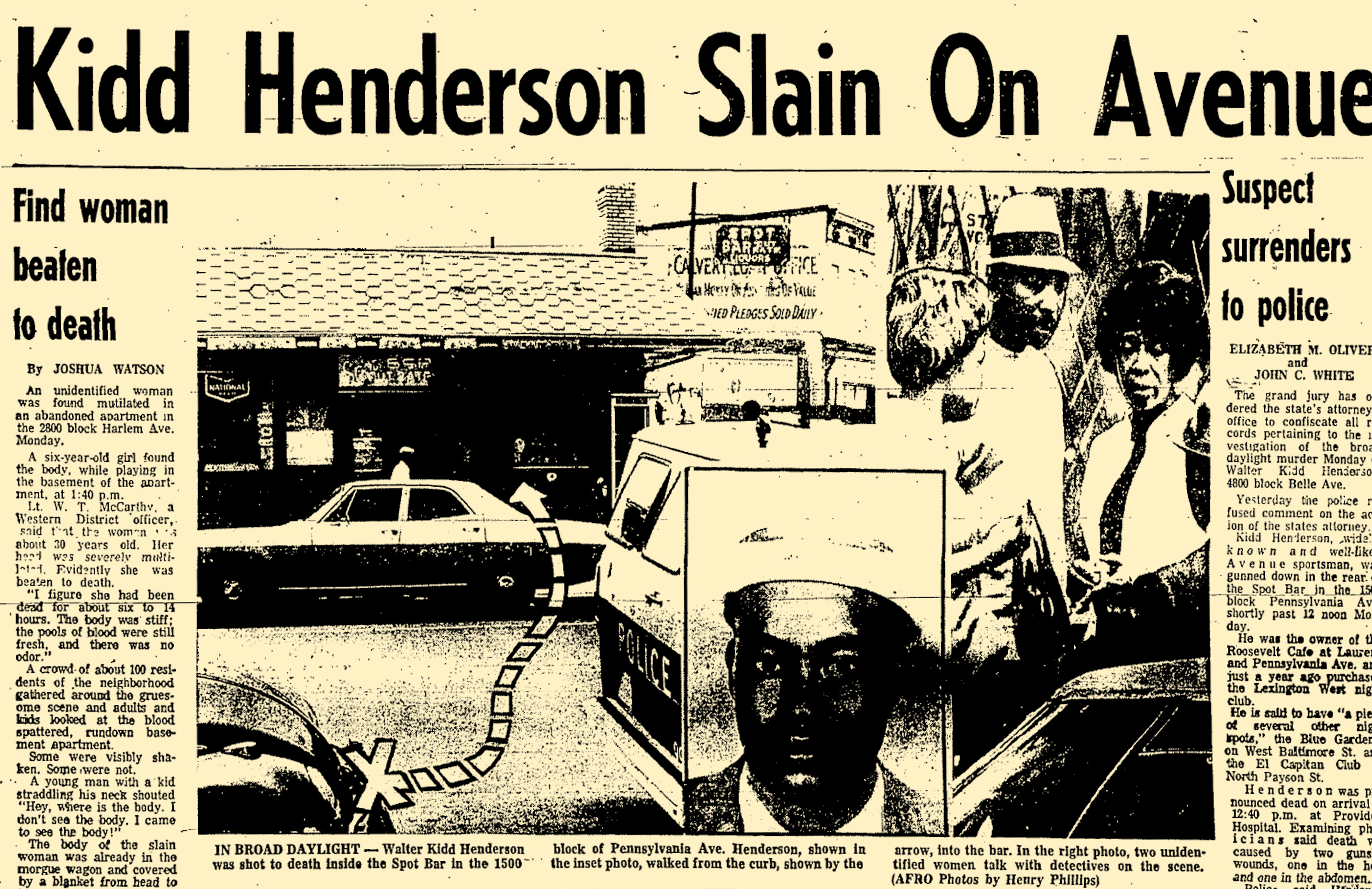Walter (Kidd) Henderson aka “Walter Kidd” or “The King” (1926-1969) was a colorful sportsman who operated in Baltimore City. Walter was born on August 25, 1926, in North Carolina.