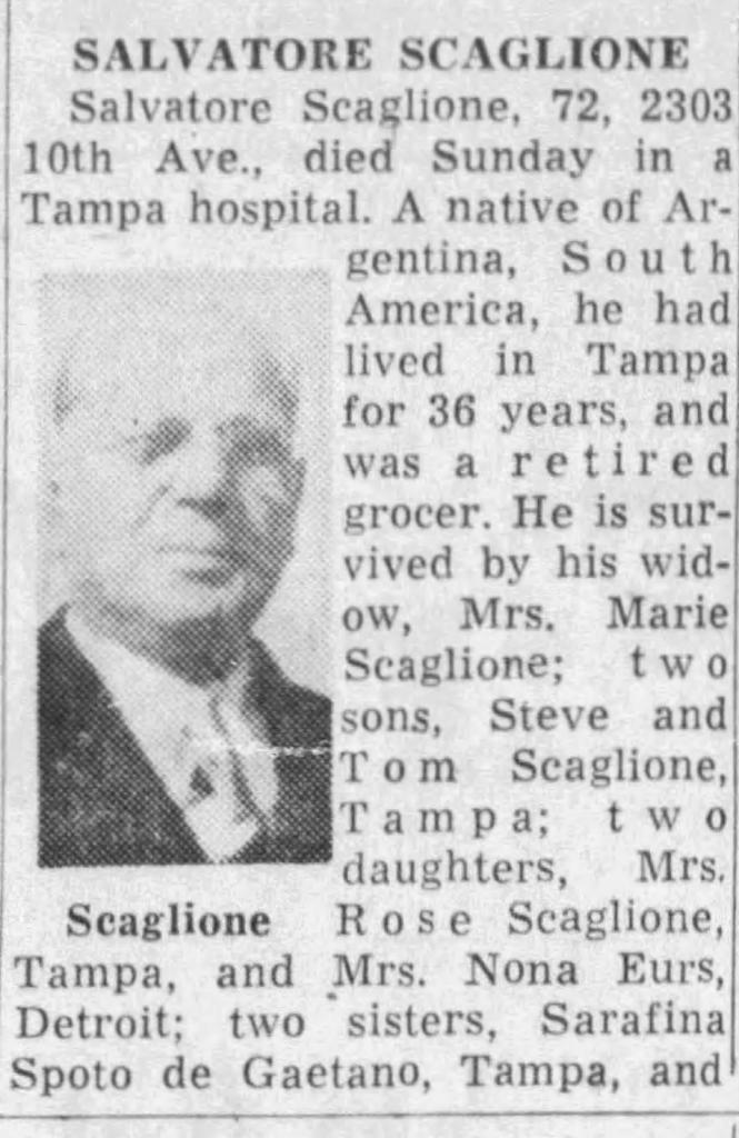 Jimmy was known to be a Freemason of the John Darling Lodge No. 154 F&AM for over 30 years and he was a owner of the F and G Macaroni Factory in West Tampa. Jimmy died on 6 Aug 1967 at the aged of 73 and is laid to rest at the Marti-Colon Cemetery which is located in Tampa, Hillsborough County, Florida.